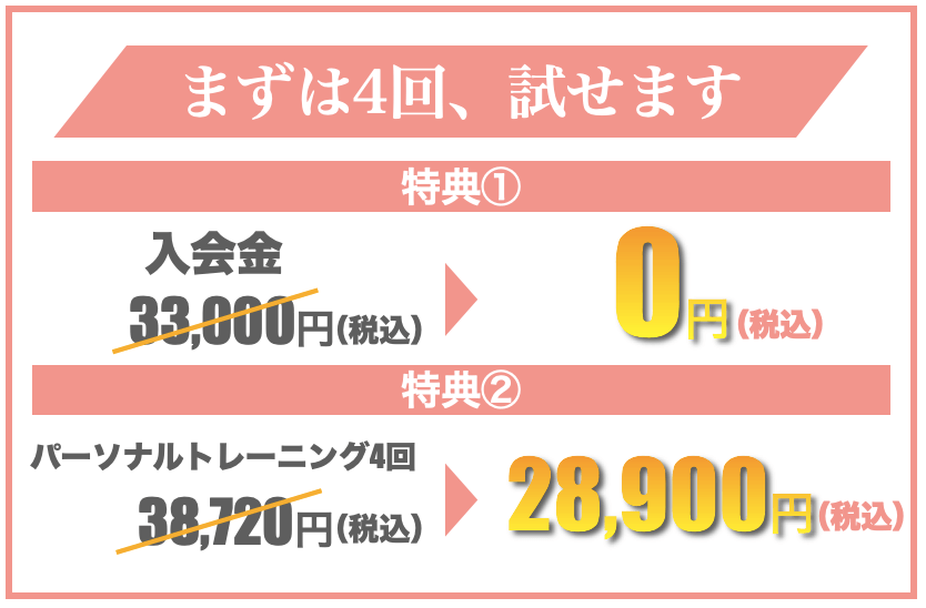 そんな方のために、初回体験は無料でご用意しています。実際にジムの雰囲気やトレーナーとの相性を確認してから決められるので、無理な勧誘も一切ありません。「まずは見てみるだけ」でも大歓迎です。